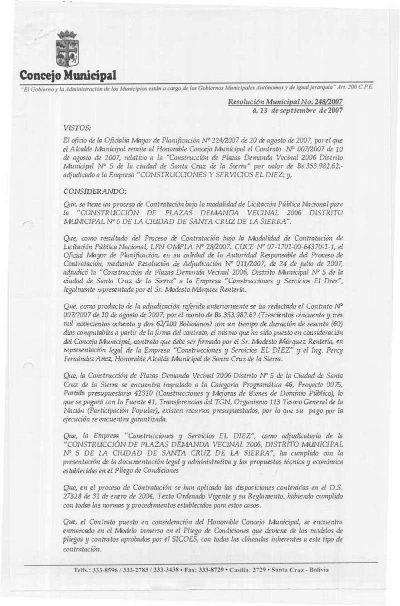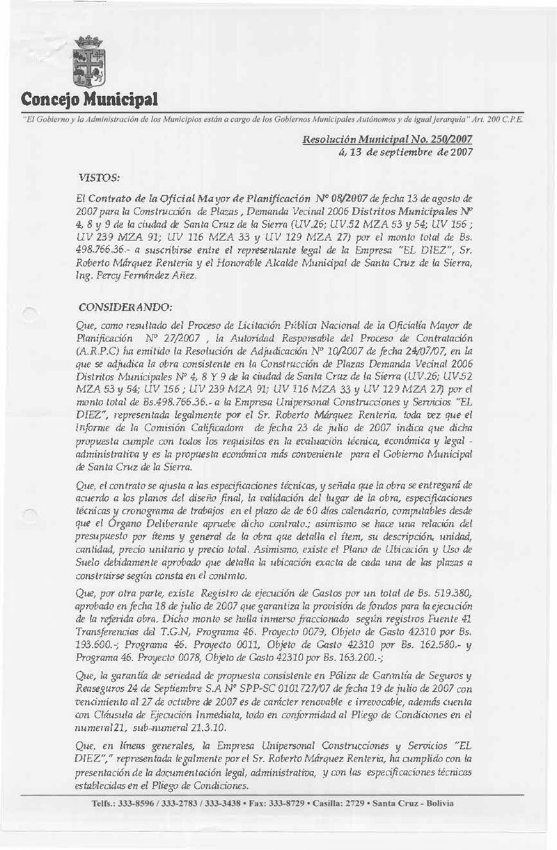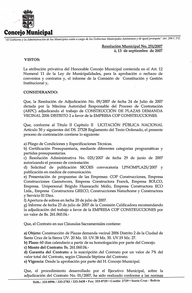 Aprueba el Contrato N°07/007 de fecha 3 de agosto de 2007, relativo a la Construcción de Plazas Demanda Vecinal 2006 Distrito Municipal N° 5 de la ciudad de Santa Cruz de la Sierra, por el monto total de Bs. 353.982.62 (Trescientos Cincuenta y Tres Mil Novecientos Ochenta y Dos 62/100 Bolivianos), adjudicado a la Empresa Constructora "EL DIEZ".