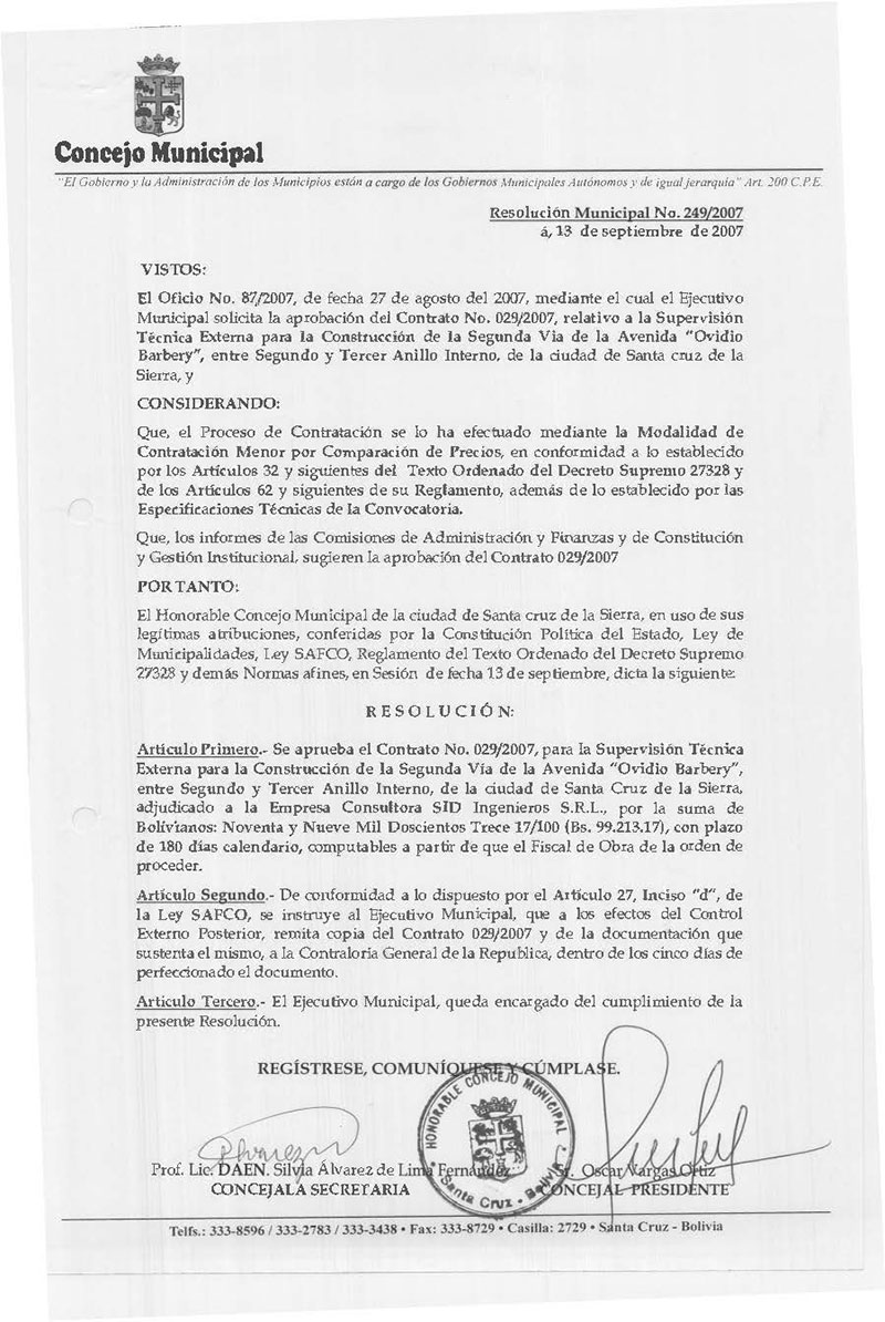 Aprueba el Contrato N° 029//2007 de 13 de septiembre relativo a la "SUPERVISIÓN TÉCNICA EXTERNA PARA LA CONSTRUCCIÓN DE LA SEGUNDA VÍA DE LA AVENIDA OVIDIO BARBERY ENTRE EL SEGUNDO Y TERCER ANILLO".