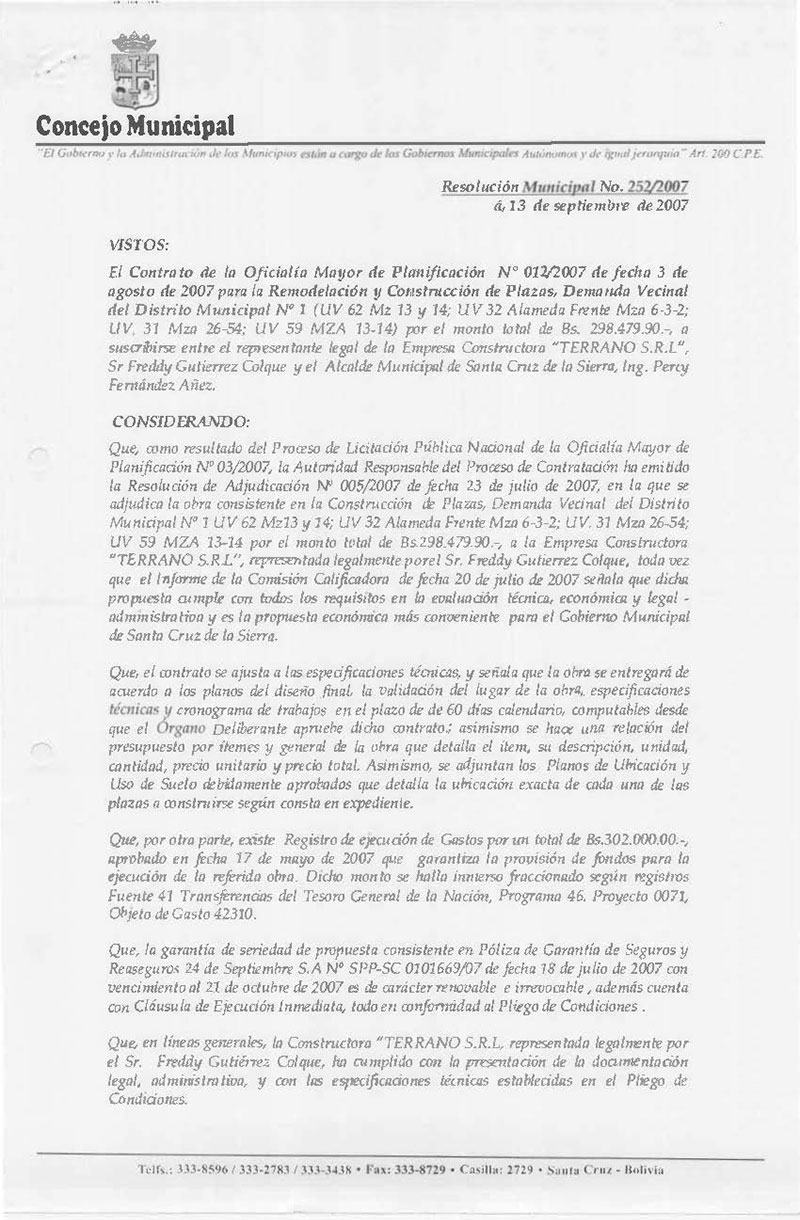 Aprueba el Contrato de la Oficialía Mayor de Planificación Nº 012/2007, para la Remodelación y Construcción de Plazas, Demanda Vecinal del Distrito Municipal Nº 1, UV 62, Mz13 y 14; UV 32 Alameda Frente Mza 6-3-2; UV. 31 Mza 26-54; UV 59 MZA 13-14 por el monto total de Bs. 298.479.90.- (Doscientos Noventa y Ocho Mil Cuatrocientos Setenta y Nueve 90/100 Bolivianos), suscrita con la Empresa Constructora “TERRANO S.R.L”.