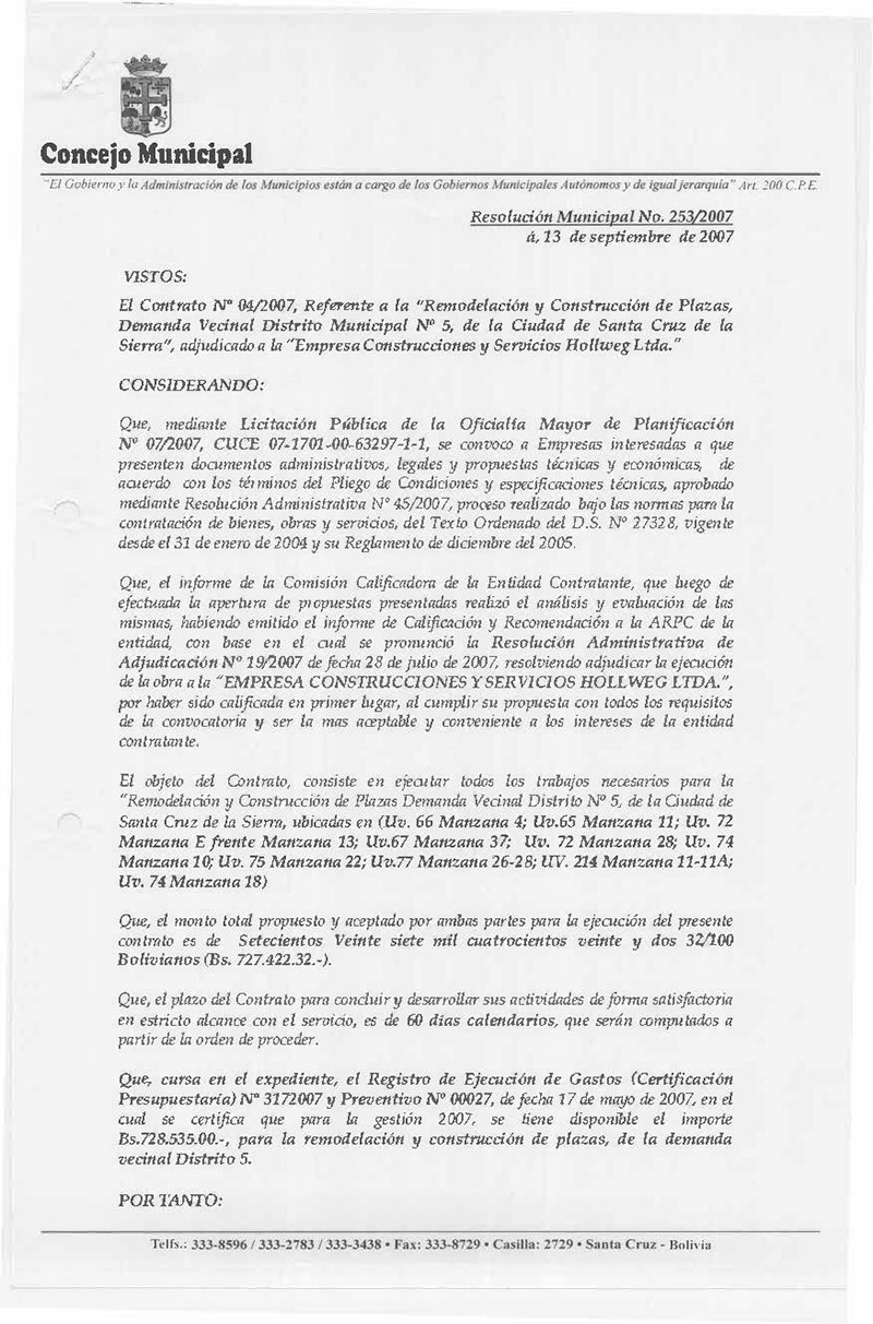 Aprueba el Contrato Nº 04/2007, referente a la “REMODELACIÓN Y CONSTRUCCIÓN DE PLAZAS, DEMANDA VECINAL DISTRITO MUNICIPAL Nº 5, DE LA CIUDAD DE SANTA CRUZ DE LA SIERRA”, adjudicado a la “EMPRESA CONSTRUCCIONES Y SERVICIOS HOLLWEG LTDA.”.