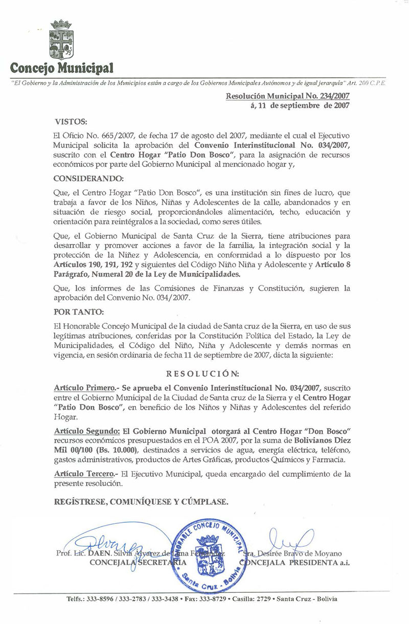 Aprueba el Convenio Interinstitucional N° 034/2007, suscrito entre el Gobierno Municipal de la Ciudad de Santa cruz de la Sierra y el Centro Hogar “Patio Don Bosco”.