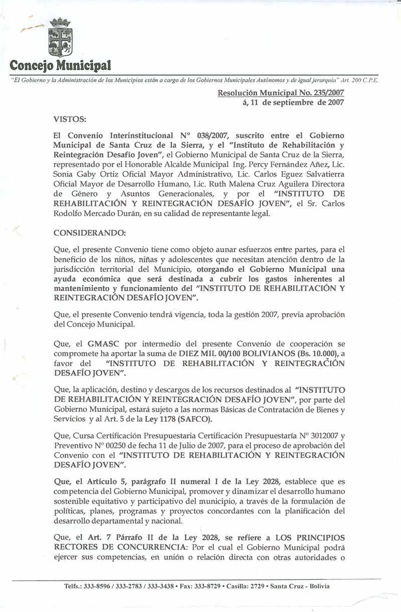 Aprueba el CONVENIO INTERINSTITUCIONAL Nº 038/2007, SUSCRITO ENTRE EL GOBIERNO MUNICIPAL DE SANTA CRUZ DE LA SIERRA, Y EL “INSTITUTO DE REHABILITACIÓN Y REINTEGRACIÓN DESAFÍO JOVEN”.