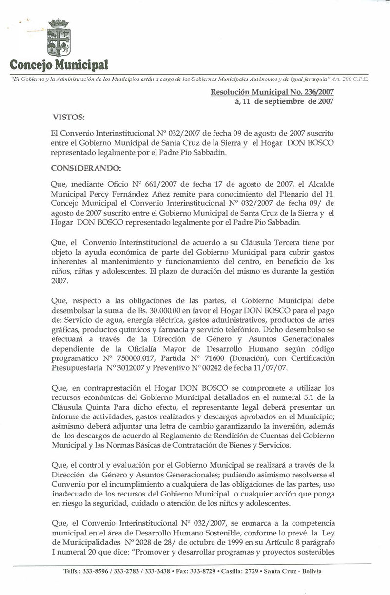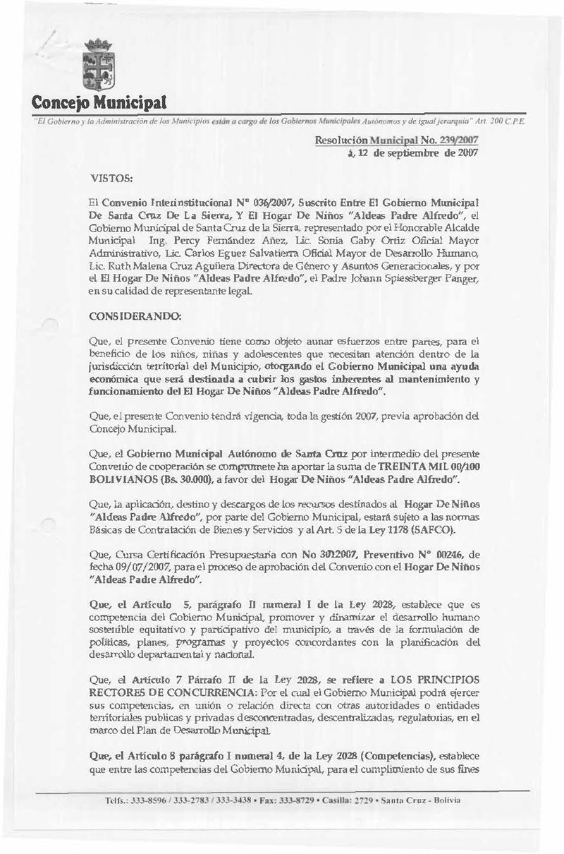 Aprueba el Convenio Interinstitucional Nº 036/2007, Suscrito Entre El Gobierno Municipal De Santa Cruz de la Sierra y El Hogar De Niños “Aldeas Padre Alfredo”.