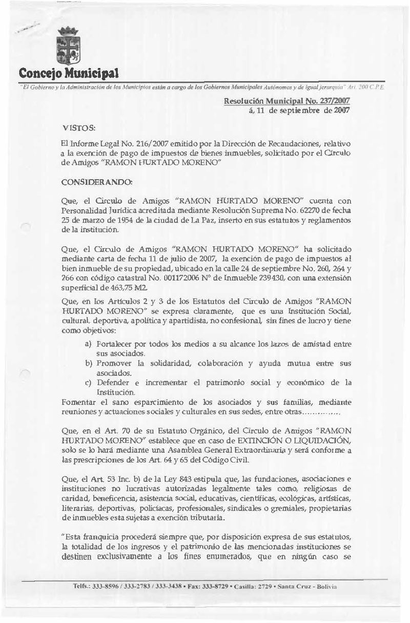 Rechaza la exención de Impuestos Municipales a la propiedad Inmueble; presentada por el Círculo de Amigos “RAMON HURTADO MORENO”.