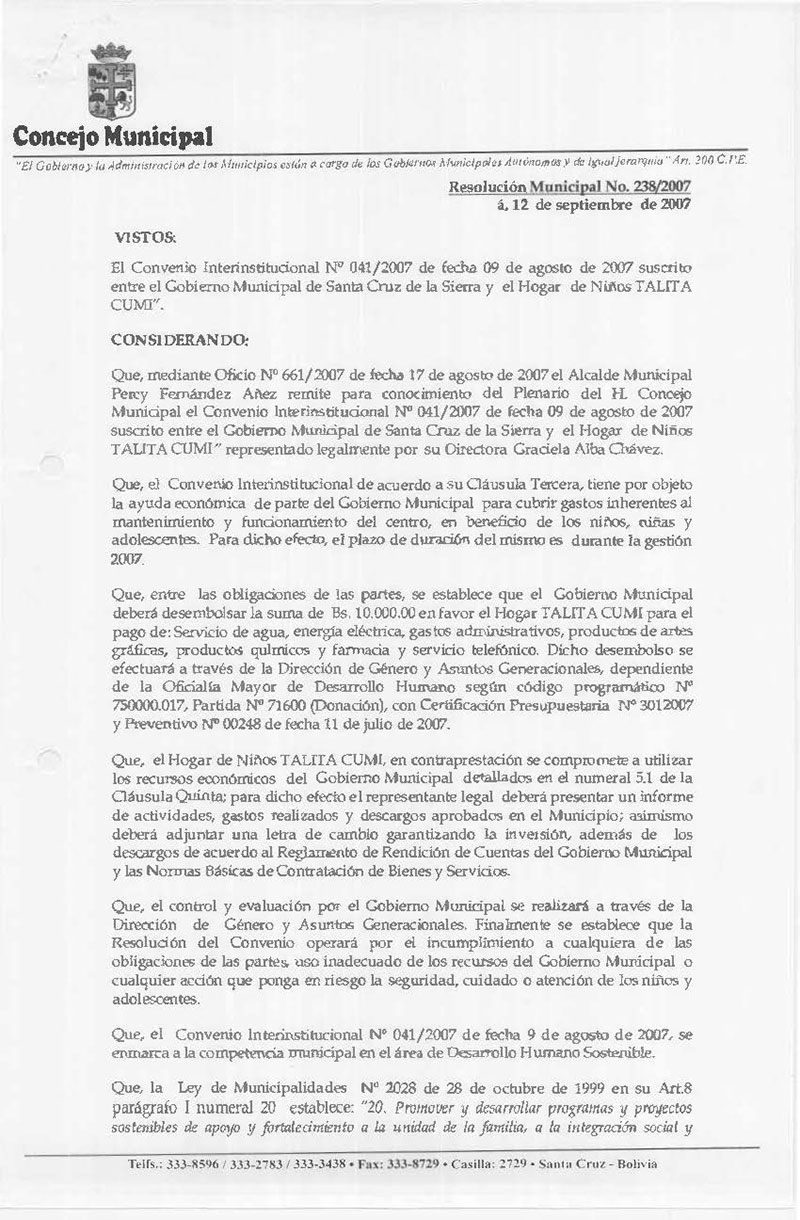 Aprueba el Convenio Interinstitucional Nº 041/2007,suscrito entre el Gobierno Municipal de Santa Cruz de la Sierra y el Hogar de Niños TALITA CUMI”.