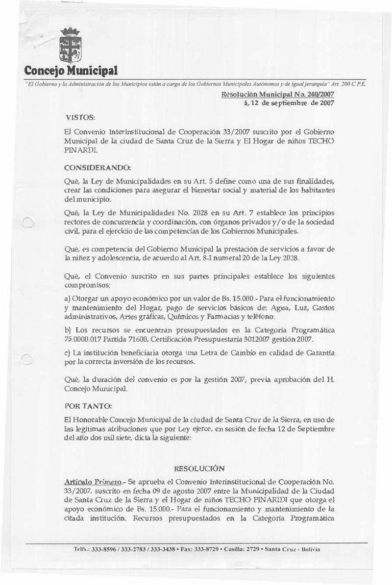 Aprueba el Convenio Interinstitucional de Cooperación N°33/2007, suscrito entre la Municipalidad de la Ciudad de Santa Cruz de la Sierra y el Hogar de niños TECHO PINARIDI.