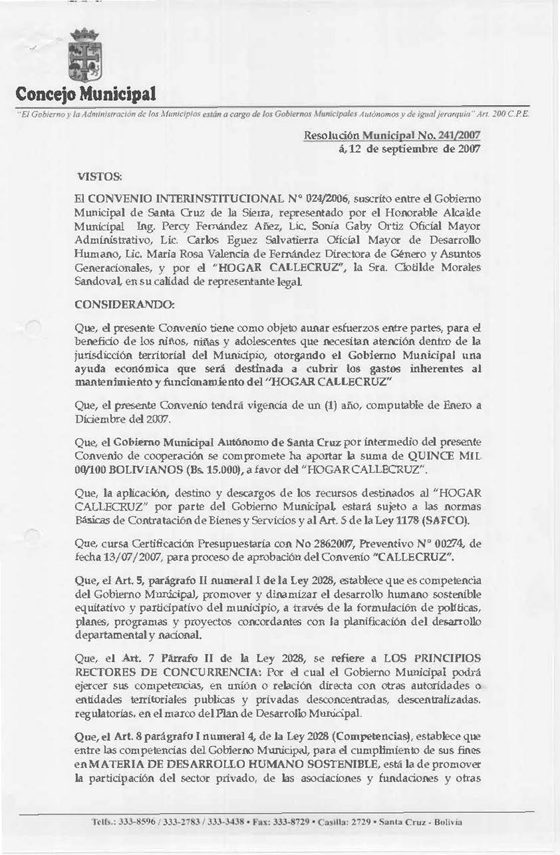 Aprueba el CONVENIO INTERINSTITUCIONAL Nº 024/2007, suscrito entre el Gobierno Municipal de Santa Cruz de la Sierra y el “HOGAR CALLECRUZ”.