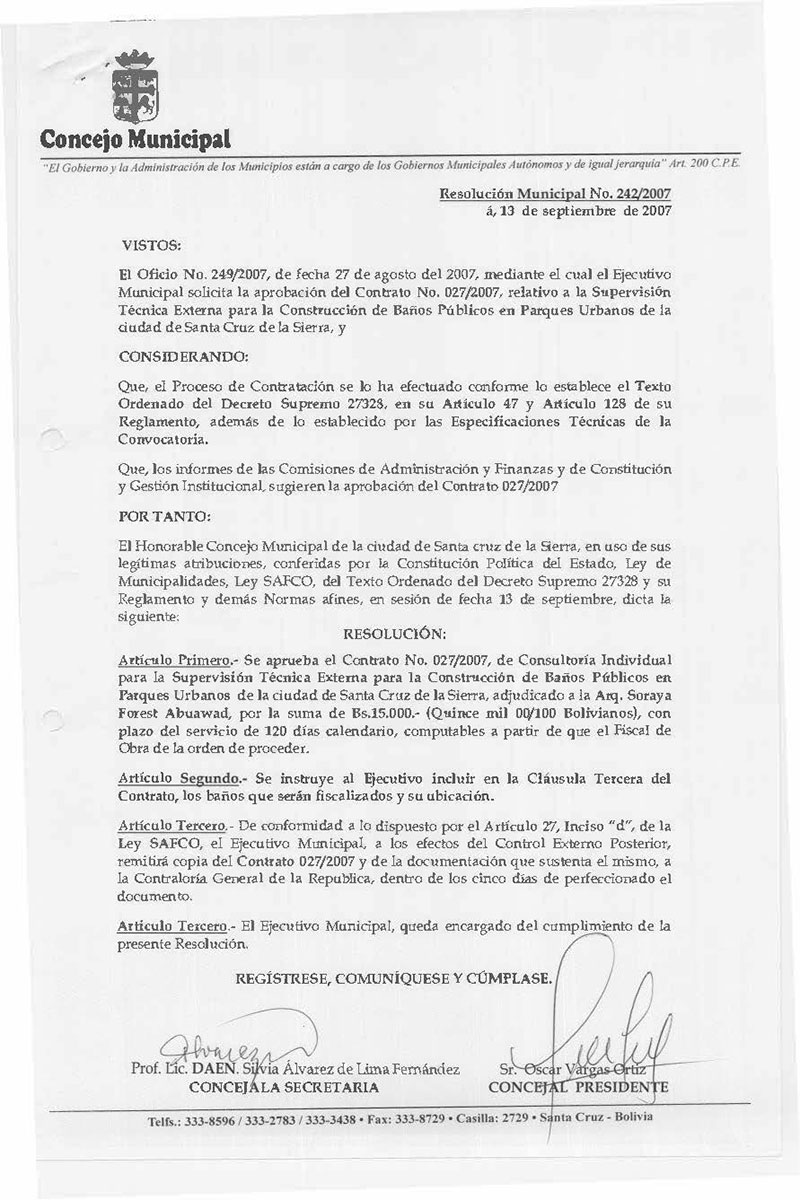 Aprueba el Contrato N° 027/2007, de Consultoría Individual para la Supervisión Técnica Externa para la Construcción de Baños Públicos en Parques Urbanos de la ciudad de Santa Cruz de la Sierra, adjudicado a la Arq. Soraya Forest Abuawad, por la suma de Bs. 15.000.- (Quince mil 00/100 Bolivianos).