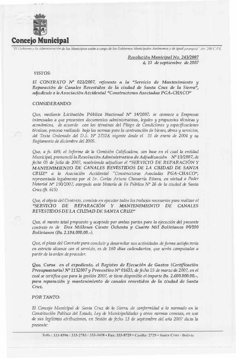 Aprueba el Contrato Nº 022/2007, referente al “SERVICIO DE REPARACIÓN Y MANTENIMIENTO DE CANALES REVESTIDOS DE LA CIUDAD DE SANTA CRUZ”, adjudicado a la Asociación Accidental “Constructoras Asociadas PGA-CHACO”.