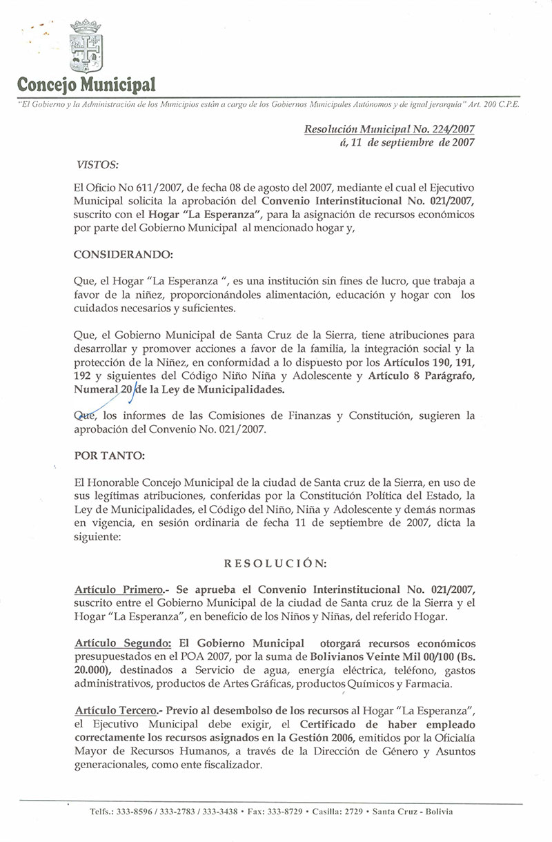 Se aprueba el Convenio Interinstitucional No. 021/2007, suscrito entre el Gobierno Municipal de la ciudad de Santa cruz de la Sierra y el Hogar “La Esperanza”, en beneficio de los Niños y Niñas, del referido Hogar. El Gobierno Municipal otorgará recursos económicos presupuestados en el POA 2007, por la suma de Bolivianos Veinte Mil 00/100 (Bs. 20.000), destinados a Servicio de agua, energía eléctrica, teléfono, gastos administrativos, productos de Artes Gráficas, productos Químicos y Farmacia.