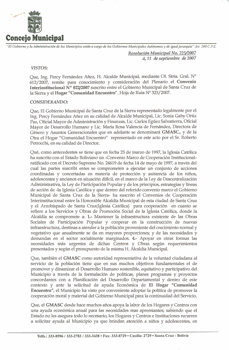 Aprueba el CONVENIO INTERINSTITUCIONAL N° 0022/2007, suscrito entre el Gobierno Municipal de Santa Cruz de la Sierra y el HOGAR “COMUNIDAD ENCUENTRO”.