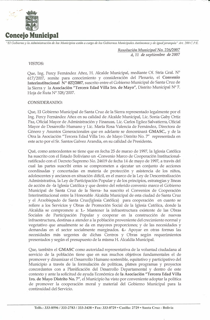 Aprueba el CONVENIO INTERINSTITUCIONAL N° 0027/2007, suscrito entre el Gobierno Municipal de Santa Cruz de la Sierra y la “ASOCIACIÓN TERCERA EDAD VILLA 1° DE MAYO DISTRITO N° 7”.