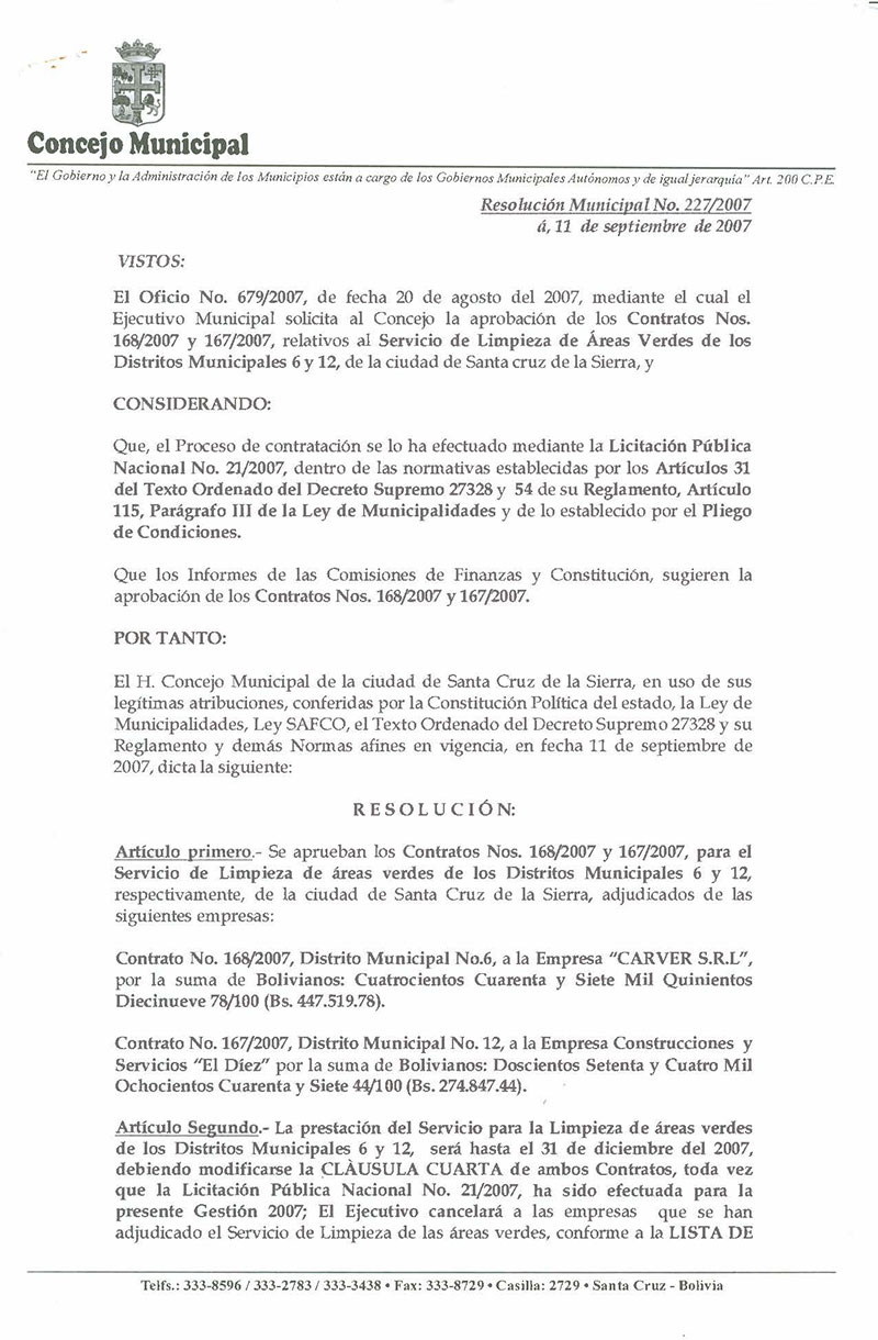 Aprueba los Contratos Nos. 168/2007 y 167/2007, para el Servicio de Limpieza de áreas verdes de los Distritos Municipales 6 y 12, respectivamente, de la ciudad de Santa Cruz de la Sierra, adjudicados de las siguientes empresas:Contrato N° 168/2007, Distrito Municipal N° 6, a la Empresa “CARVER S.R.L”.