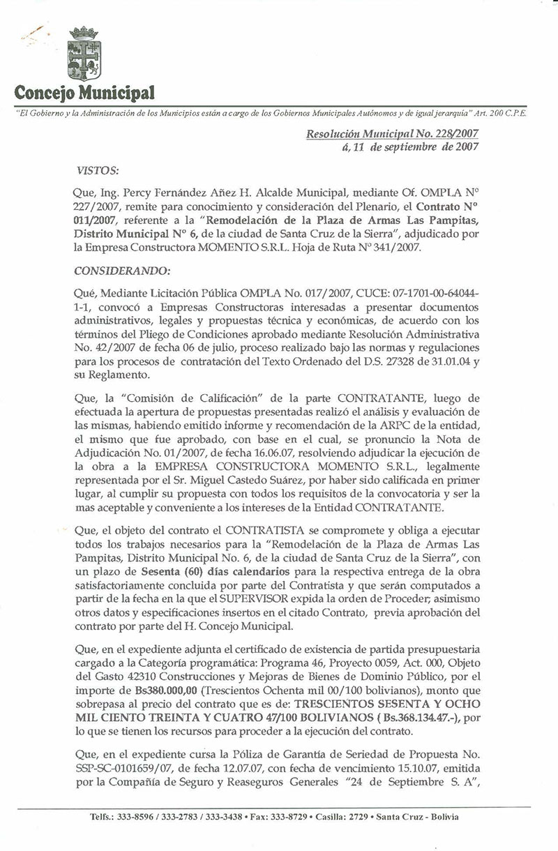 Aprueba el CONTRATO OMPLA N° 011/2007, referente a la “Remodelación de la Plaza de Armas Las Pampitas Distrito Municipal N° 6 de la Ciudad de Santa Cruz de la Sierra” suscrito con la Empresa Constructora MOMENTO S. R. L.