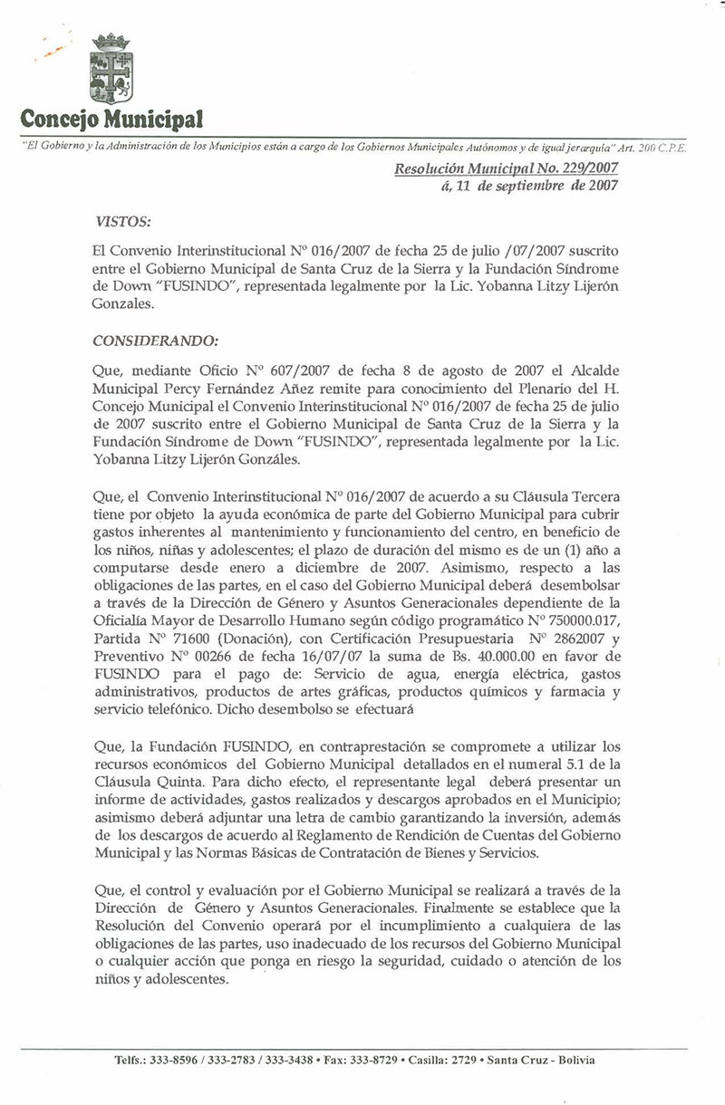 Aprueba el Convenio Interinstitucional Nº 016/2007, suscrito entre el Gobierno Municipal de Santa Cruz de la Sierra y la Fundación Síndrome de Down “FUSINDO”.