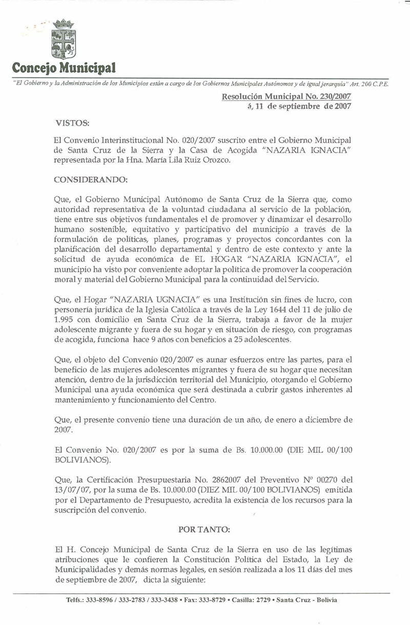 Aprueba el CONVENIO INTERINSTITUCIONAL Nº 020/2007 suscrito ENTRE EL “GOBIERNO MUNICIPAL AUTÓNOMO DE SANTA CRUZ DE LA SIERRA Y “LA CASA DE ACOGIDA “NAZARIA IGNACIA”.