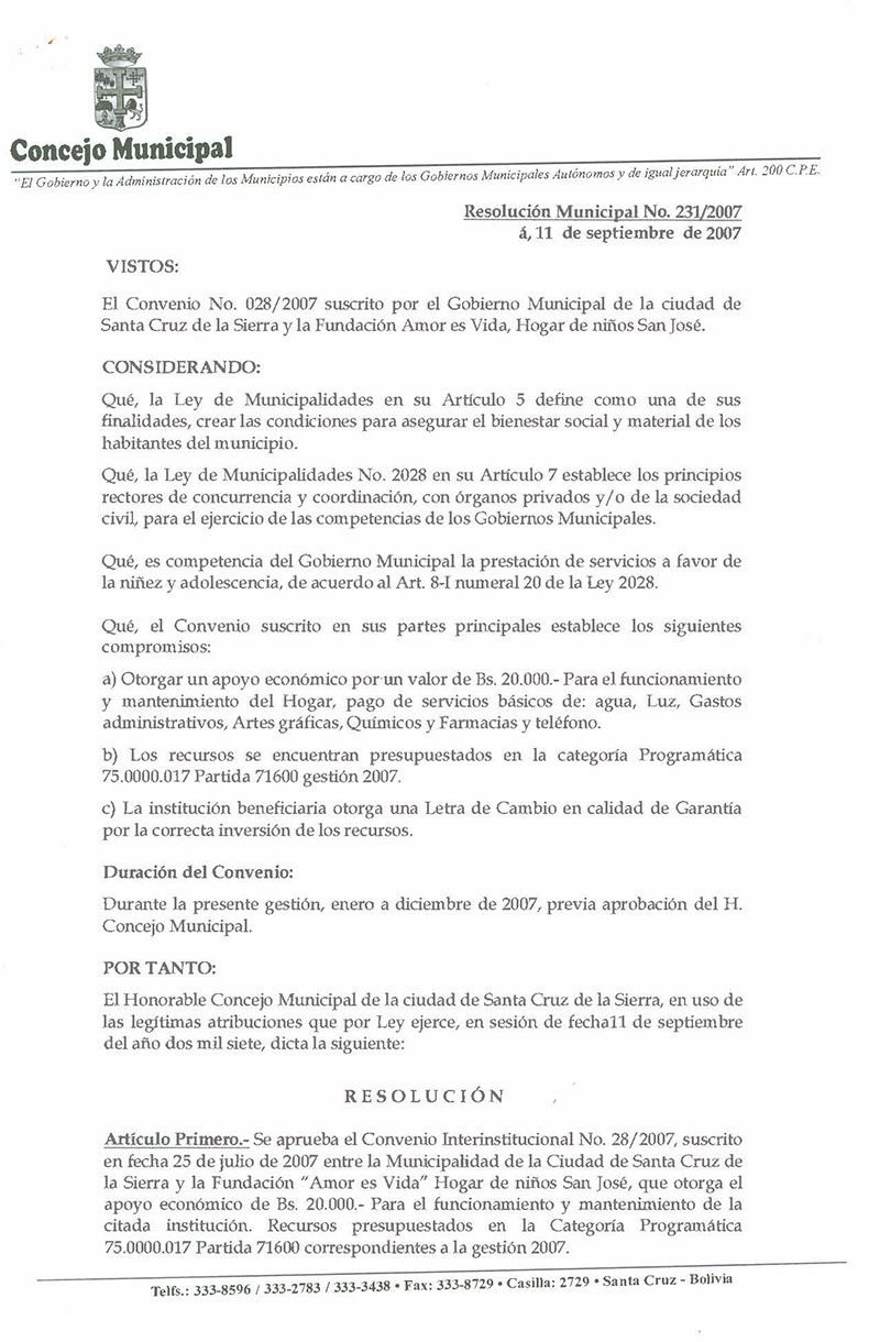 Aprueba el Convenio Interinstitucional N° 28/2007, suscrito entre el Gobierno Municipal de Santa Cruz de la Sierra y la Fundación “Amor es Vida” Hogar de niños San José.