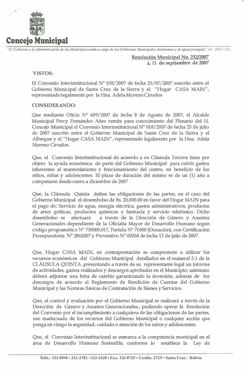 Se aprueba el Convenio Interinstitucional Nº 018/2007 suscrito entre el Gobierno Municipal de Santa Cruz de la Sierra y el "Hogar CASA MAIN".