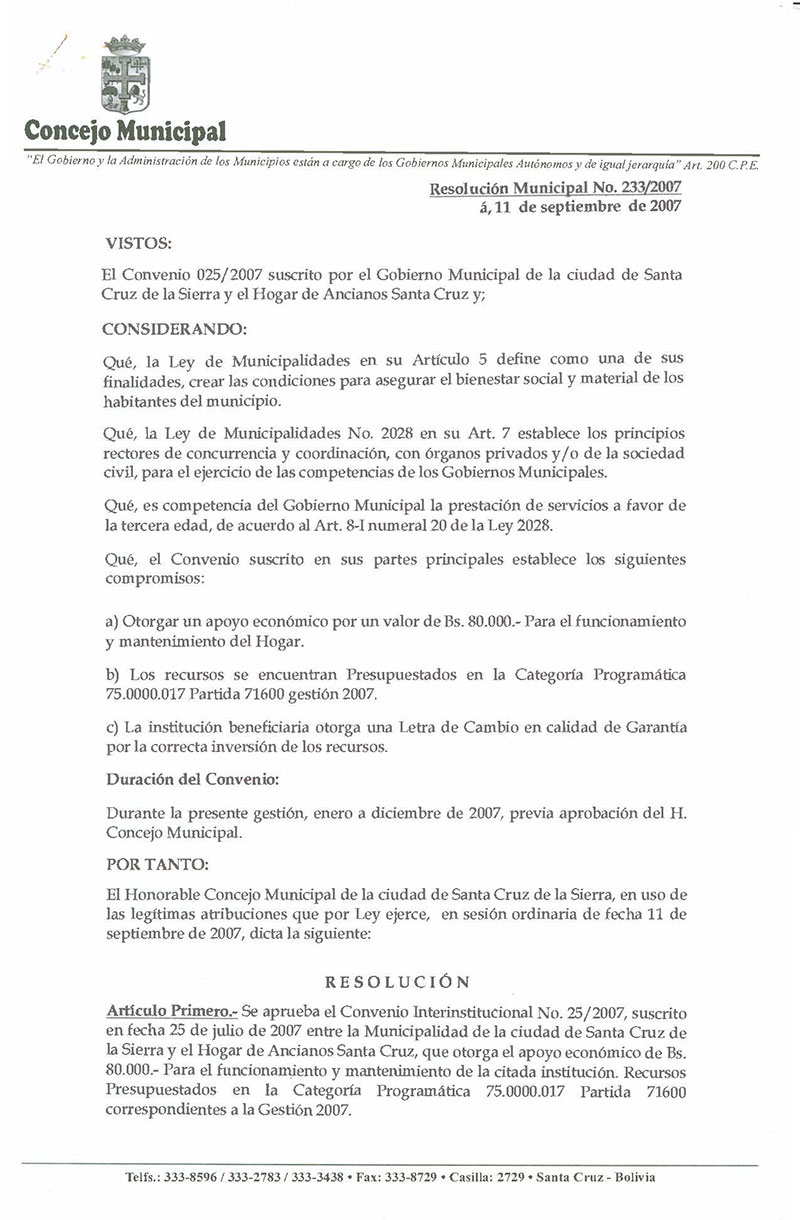 Aprueba el Convenio Interinstitucional N° 25/2007, suscrito entre el Gobierno Autónomo Municipal de Santa Cruz de la Sierra y el Hogar de Ancianos Santa Cruz.