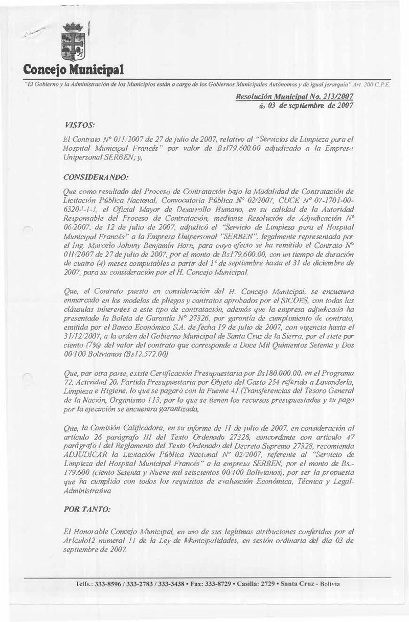 Aprueba el Contrato N° 011/2007 de 27 de julio de 2007, relativo al “SERVICIO DE LIMPIEZA PARA EL HOSPITAL MUNICIPAL FRANCES”, por el monto de Bs. 179.600.00 (CIENTO SETENTA Y NUEVE MIL SEISCIENTOS 00/100 BOLIVIANOS), adjudicada a la Empresa “SERBEN”.