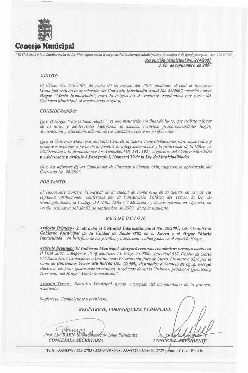 Aprueba el Convenio Interinstitucional N° 26/2007, suscrito entre el Gobierno Municipal de la Ciudad de Santa cruz de la Sierra y el Hogar “Maria Inmaculada”, en beneficio de las y Niñas, y adolescentes albergadas en el referido Hogar.