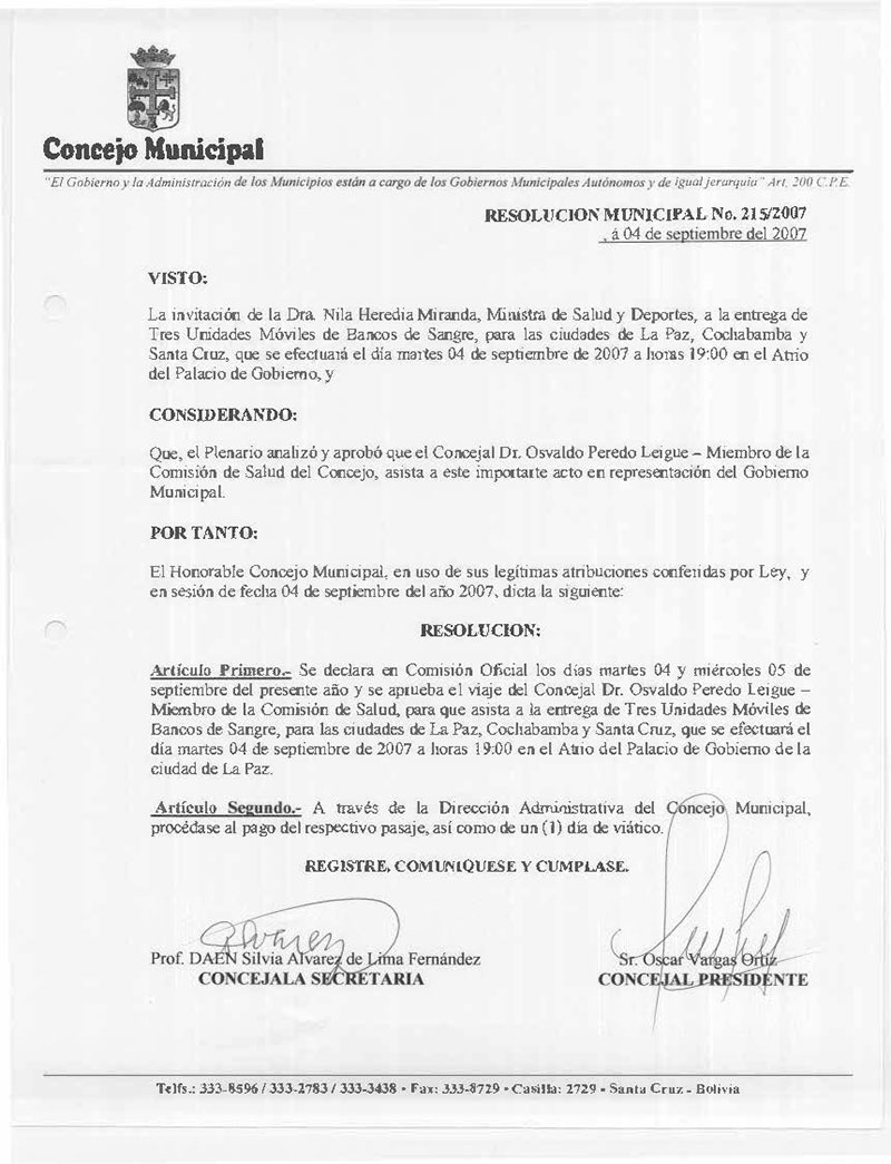 Declara en Comisión y aprueba el viaje del Concejal Dr. Osvaldo Peredo, para que asista a la entrega de Tres Unidades Móviles de Bancos de Sangre para las ciudades de La Paz, Cochabamba y Santa Cruz,que se efectuará el día martes 04 de septiembre en el Palacio de Gobierno de la ciudad de La Paz.