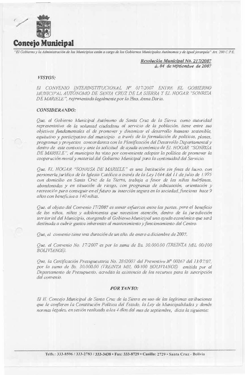 Aprueba el CONVENIO INTERINSTITUCIONAL Nº 017/2007 ENTRE EL GOBIERNO MUNICIPAL AUTÓNOMO DE SANTA CRUZ DE LA SIERRA Y EL HOGAR “SONRISA DE MARIELE”.