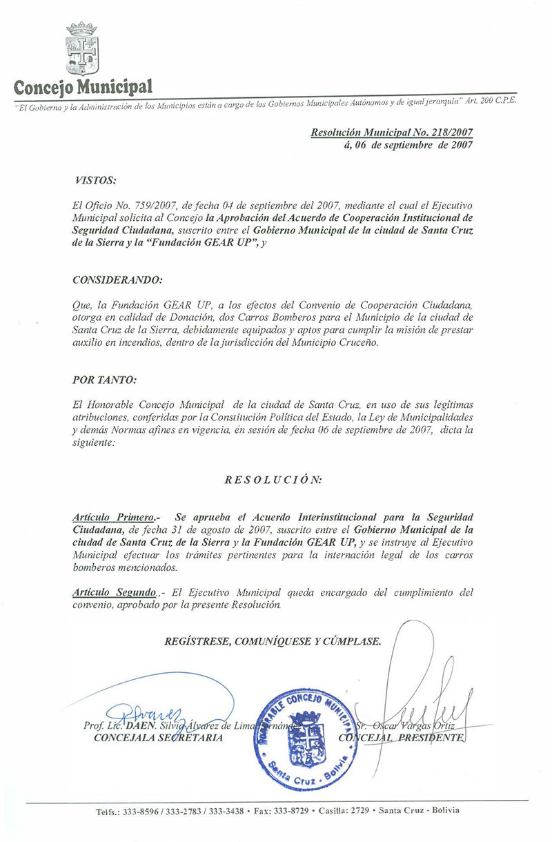 Aprueba el Acuerdo Interinstitucional para la Seguridad Ciudadana, suscrito entre el Gobierno Municipal de la ciudad de Santa Cruz de la Sierra y la Fundación GEAR UP, y se instruye al Ejecutivo Municipal efectuar los trámites pertinentes para la internación legal de los carros bomberos mencionados.