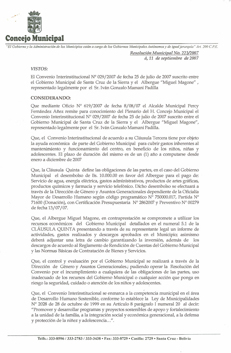 Aprueba el Convenio Interinstitucional Nº 029/2007, suscrito Gobierno Municipal de Santa Cruz de la Sierra y el Albergue “Miguel Magone”.