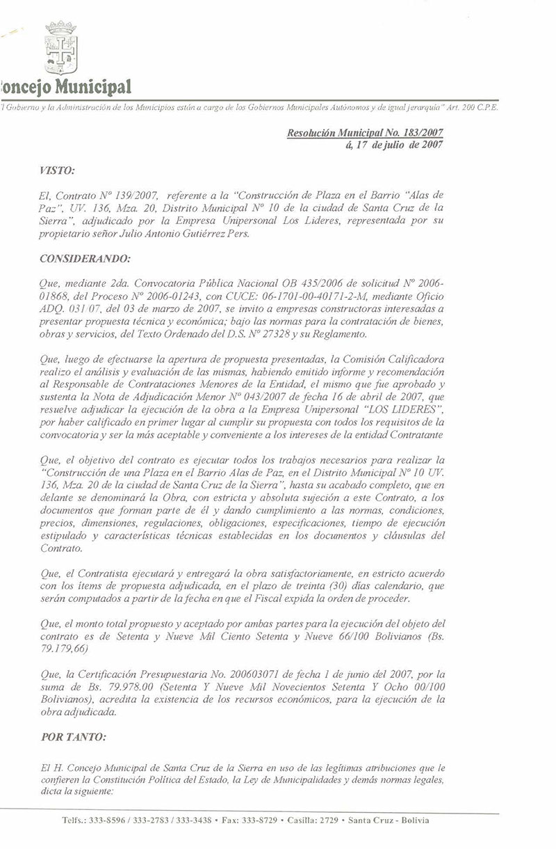 Se aprueba el Contrato Nº 139/2007, referente a la “Construcción de Plaza en el Barrio Alas de Paz UV. 136, Mza. 20, Distrito Municipal Nº 10 de la ciudad de Santa Cruz de la Sierra”, adjudicado por la Empresa Unipersonal Los Lideres, representada por su propietario señor Julio Antonio Gutiérrez Pers.