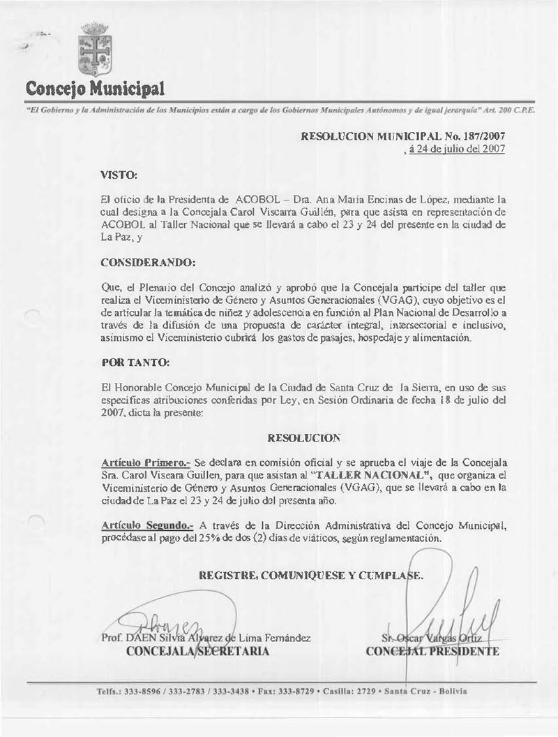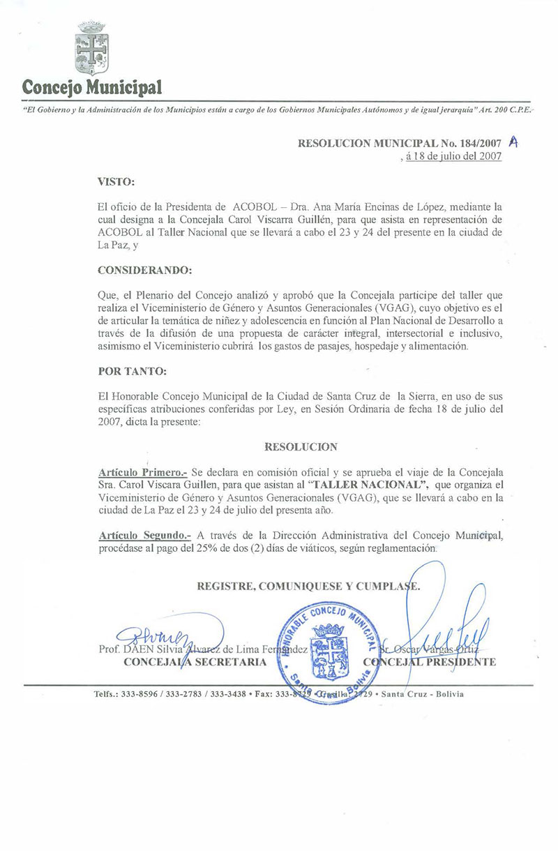 Declara en Comisión Oficial y Aprueba el viaje de la Concejala Sra. Carol Viscarra, para que asista al TALLER NACIONAL, que organiza el Viceministerio de Género y asuntos Generacionales que se realizará en la ciudad de La Paz, 23 y 24 de julio del presente año.