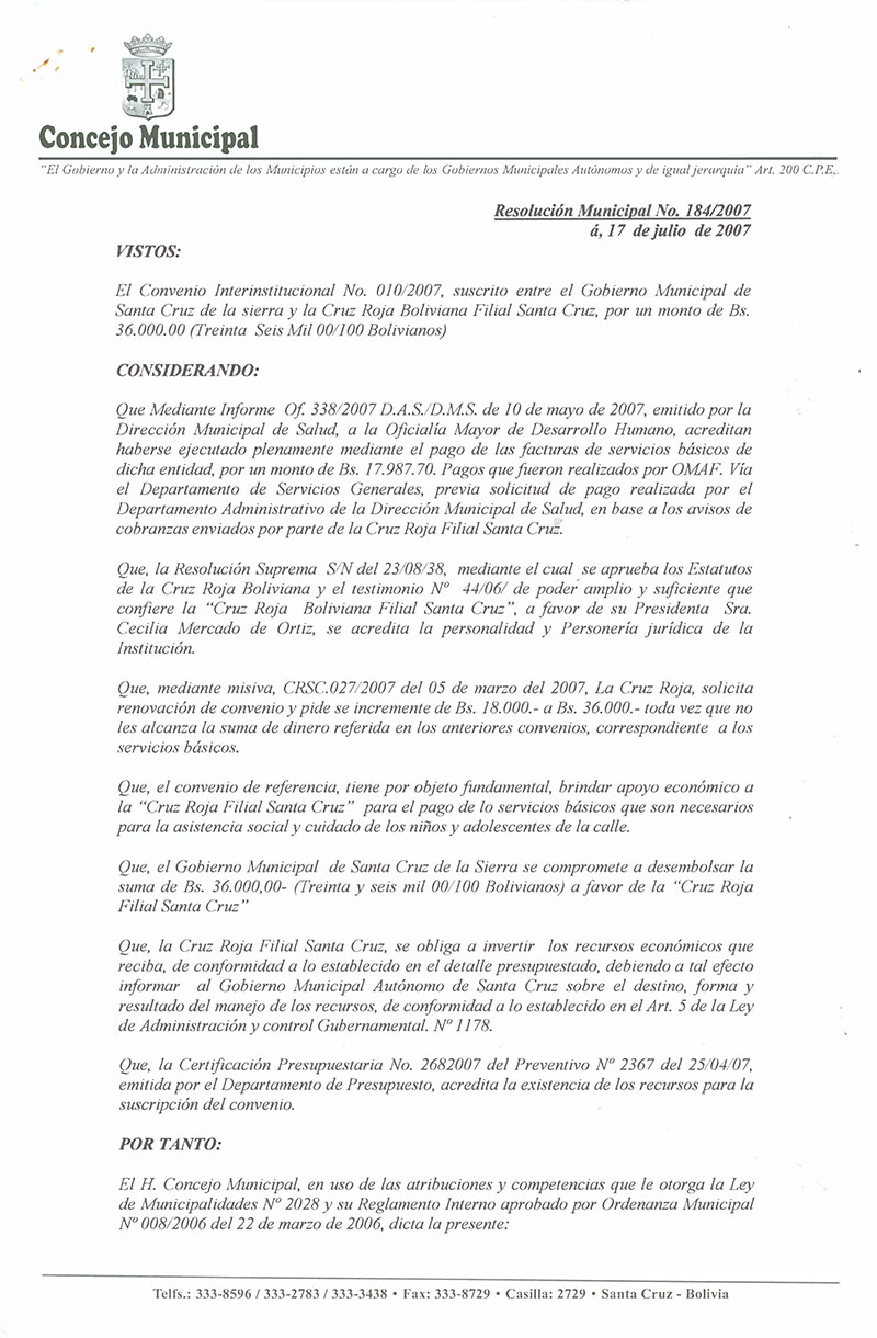 Aprueba el Convenio Interinstitucional N° 010/2007, suscrito entre el Gobierno Municipal de Santa Cruz de la sierra y la Cruz Roja Boliviana Filial Santa Cruz.