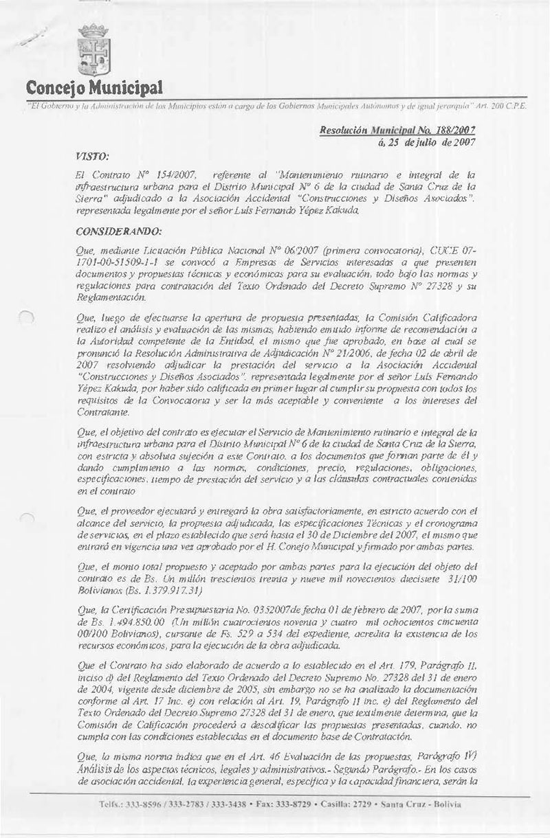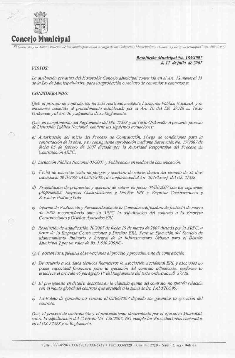 Rechaza el Contrato N° 158/2007 adjudicado en favor de la Empresa Construcciones y Diseños ERL, para la Ejecución del Servicio de Mantenimiento Rutinario e Integral de la Infraestructura Urbana para el Distrito Municipal N°2 por un valor de Bs. 1.650.206,96 (Un Millón Seiscientos Cincuenta Mil Doscientos Seis 96/100 Bolivianos).