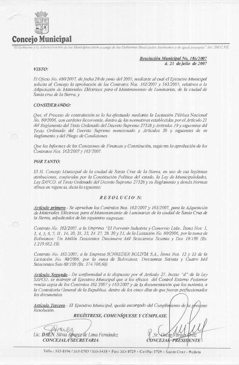 Se aprueban los Contratos Nos. 162/2007 y 163/2007, para la Adquisición de Materiales Eléctricos para el Mantenimiento de Luminarias de la ciudad de Santa Cruz de la Sierra, adjudicados a las empresas “El Porvenir Industria y Comercio Ltda. y la Empresa SCHREDER BOLIVIA S.A.