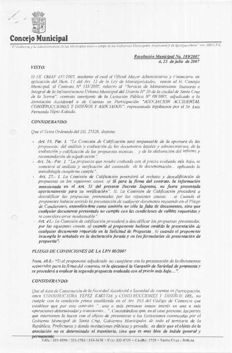 Rechaza el Contrato Nº 154/2007, referente al “Mantenimiento rutinario e Integral de la Infraestructura Urbana para el Distrito Municipal Nº 6 de la ciudad de Santa Cruz de la Sierra” adjudicado a la Asociación Accidental “Construcciones y Diseños Asociados”.