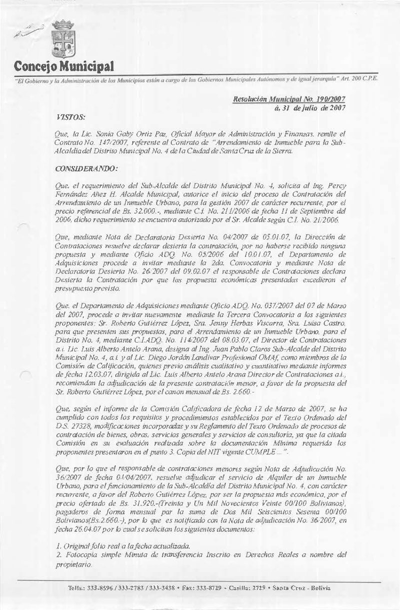 Aprueba el Contrato N°147/2007 referente al “Arrendamiento de un bien Inmueble Urbano para la Sub-Alcaldía del Distrito Nº 4 de la Ciudad de Santa Cruz de la Sierra”, suscrito con los Sres. Roberto Gutiérrez López y Luisa Castro de Gutiérrez.