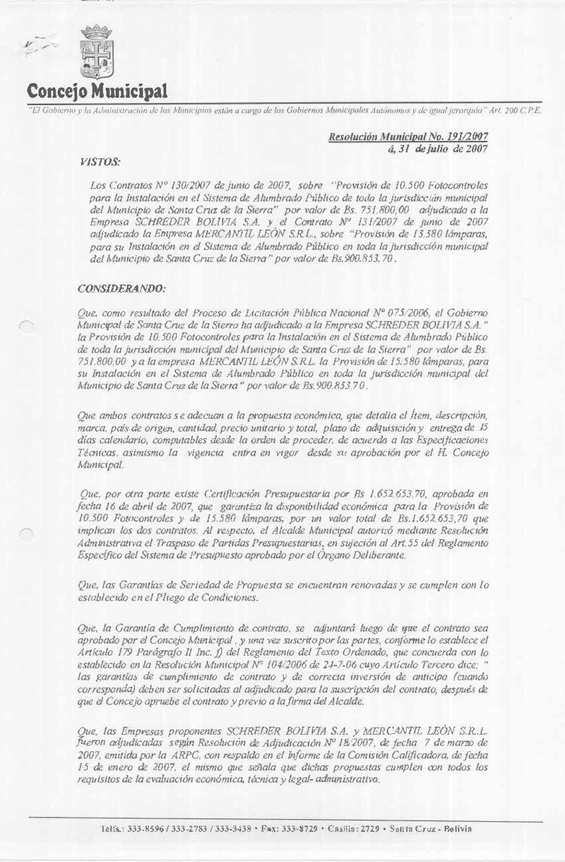 Aprueba el Contrato Nº 130/2007, sobre “Provisión de 10.500 Fotocontroles para la Instalación en el Sistema de Alumbrado Público de toda la jurisdicción municipal del Departamento de Santa Cruz de la Sierra” por valor de Bs. 751.800,00 (Setecientos Cincuenta y Un Mil Ochocientos 00/100 Bolivianos), adjudicado a la Empresa SCHREDER BOLIVIA S.A.