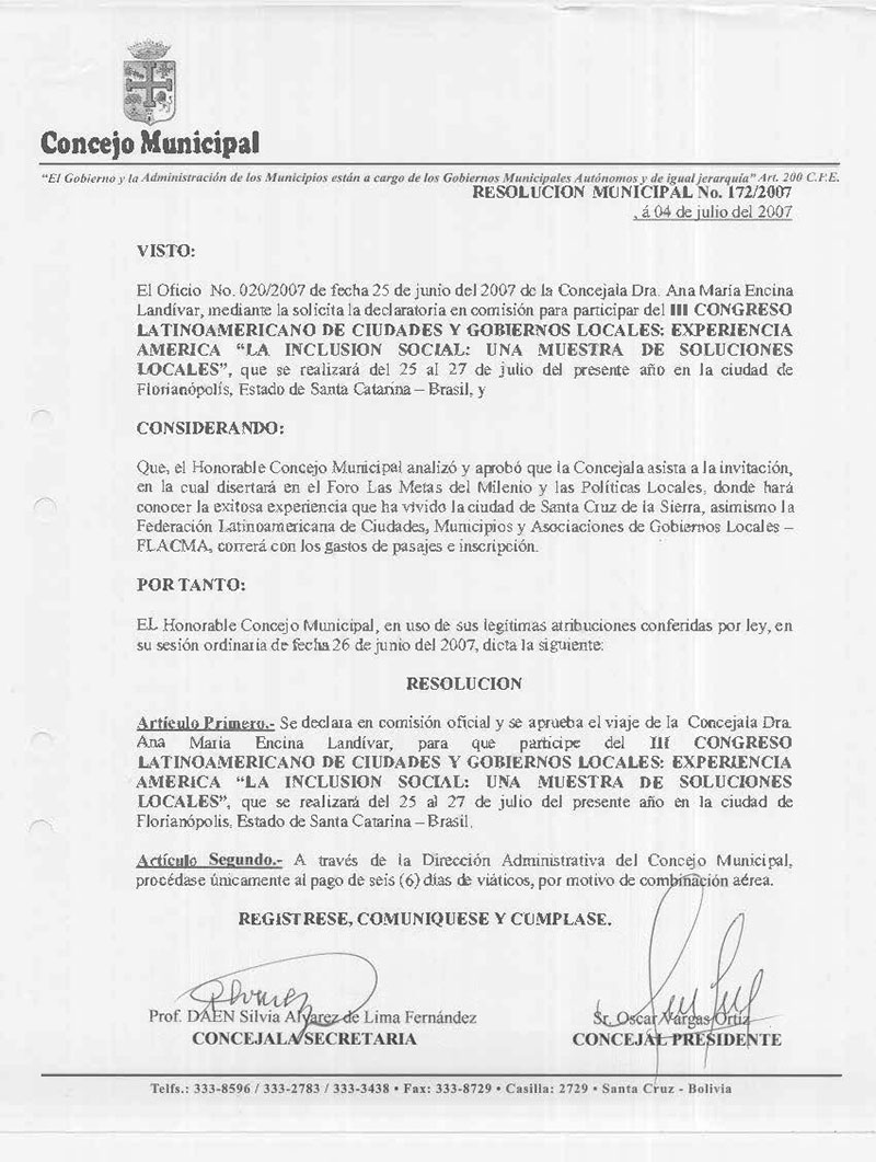 Declara en Comisión y aprueba el viaje de la Concejal Dra. Ana Maria Encinas, para que participe del III CONGRESO LATINOAMERICANO DE CIUDADES Y GOBIERNOS LOCALES: EXPERIENCIA AMERICA LA INCLUSION SOCIAL : UNA MUESTRA DE SOLUCIONES LOCALES, que se realizará en FLORIANAPOLIS -BRASIL.