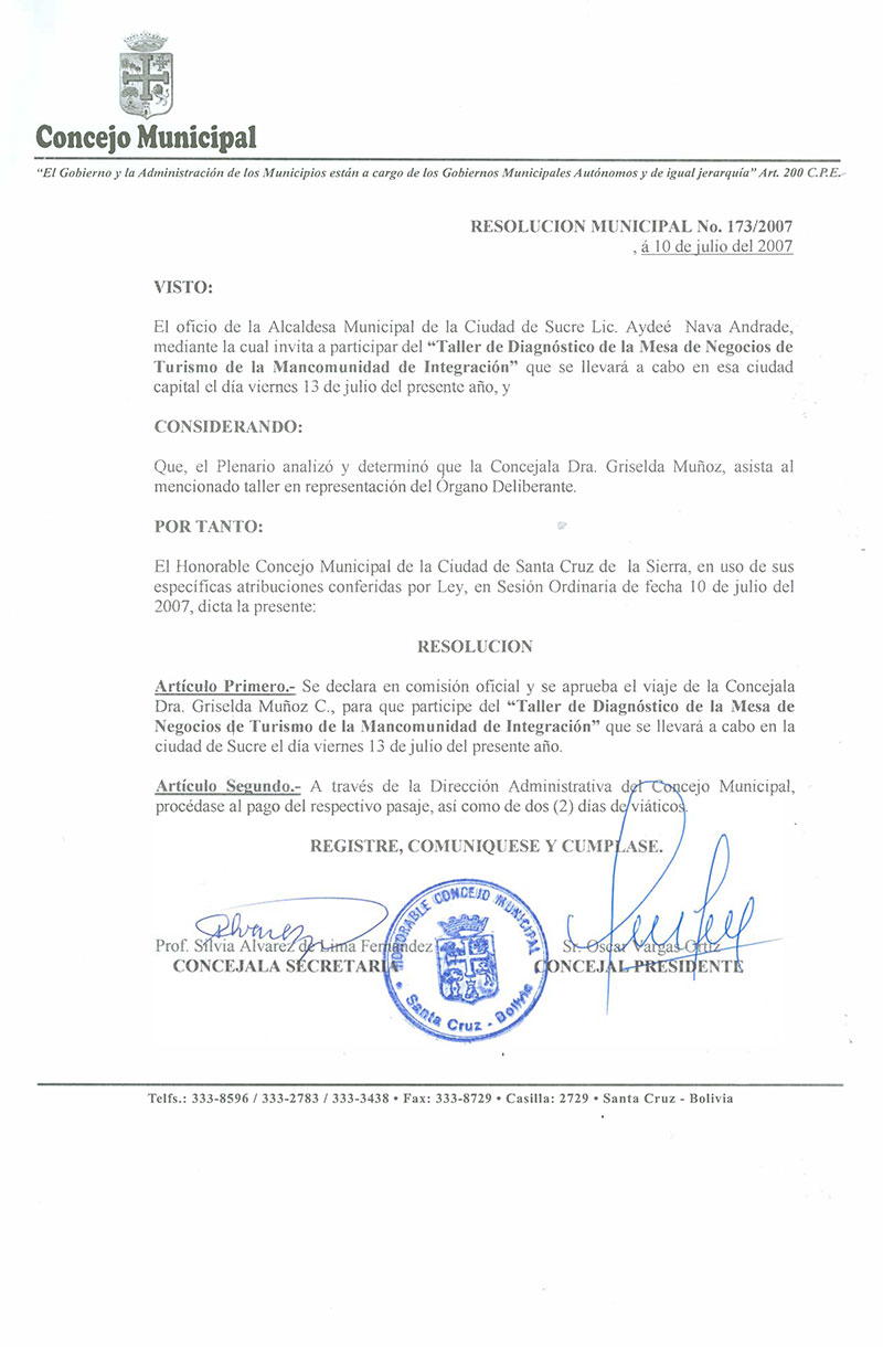 Se declara en comisión oficial y se aprueba el viaje de la Concejala Dra. Griselda Muñoz C., para que participe del "Taller de Diagnóstico de la Mesa de Negocios de Turismo de la Mancomunidad de Integración" que se llevará a cabo en laciudad de Sucre el día viernes 13 de julio del presente año.