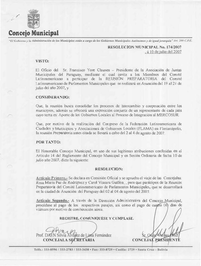 Declara en Comisión y aprueba el viaje de las Concejalas Rosa Maria Paz y Carol Viscarra, para que participen de la Reunión Preparatoria del Comité Latinoamericano de Parlamentos Municipales, que se desarrollará en Asunción del Paraguay del 02 al 04 de agosto del 2007.