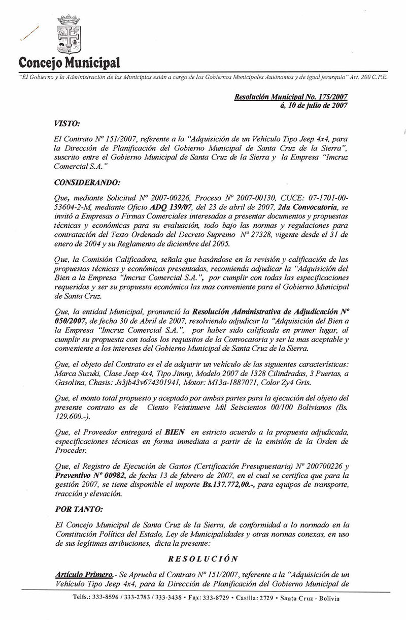 Se Aprueba el Contrato Nº 151/2007, referente a la “Adquisición de un Vehículo Tipo Jeep 4x4, para la Dirección de Planificación del Gobierno Municipal de Santa Cruz de la Sierra”, Suscrito entre el Gobierno Municipal de Santa Cruz de la Sierra y la Empresa “Imcruz Comercial S.A.”.