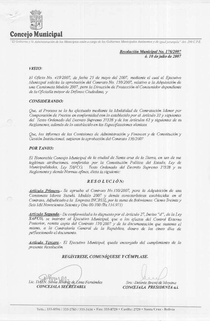 Aprueba el Contrato N°150/2007, para la Adquisición de una Camioneta Marca Suzuki, Modelo 2007 y demás características establecidas en el Contrato, Adjudicado a la Empresa INCRUZ, por la suma de Bs.136.971 (Ciento Treinta y Seis Mil Novecientos Setenta y Uno 00/100).