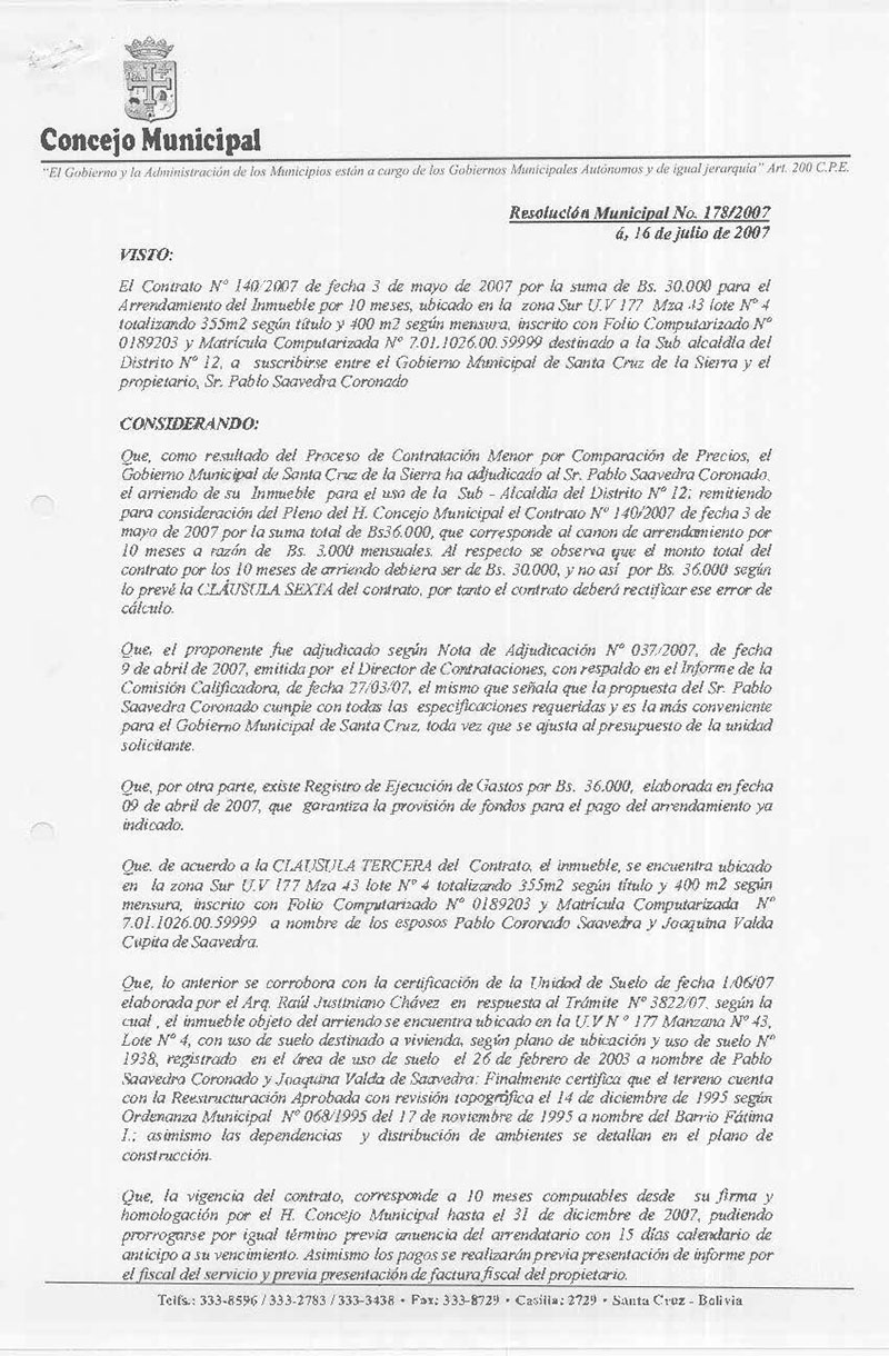 Aprueba el Contrato Nº 140/200, para el arrendamiento del Inmueble por el plazo de 10 meses, ubicado en la zona Sur U.V. 177 Mza 43 lote Nº 4 totalizando 355 m2 según título y 400 m2 según mensura, inscrito con Folio Computarizado Nº 0189203 y Matrícula Computarizada Nº 7.01.1026.00.59999 destinado a la Sub Alcaldía del Distrito Nº 12 ,por la suma de Bs. 30.000 (Treinta Mil 00/100 Bolivianos) a suscribirse con el propietario, Sr. Pablo Saavedra Coronado.