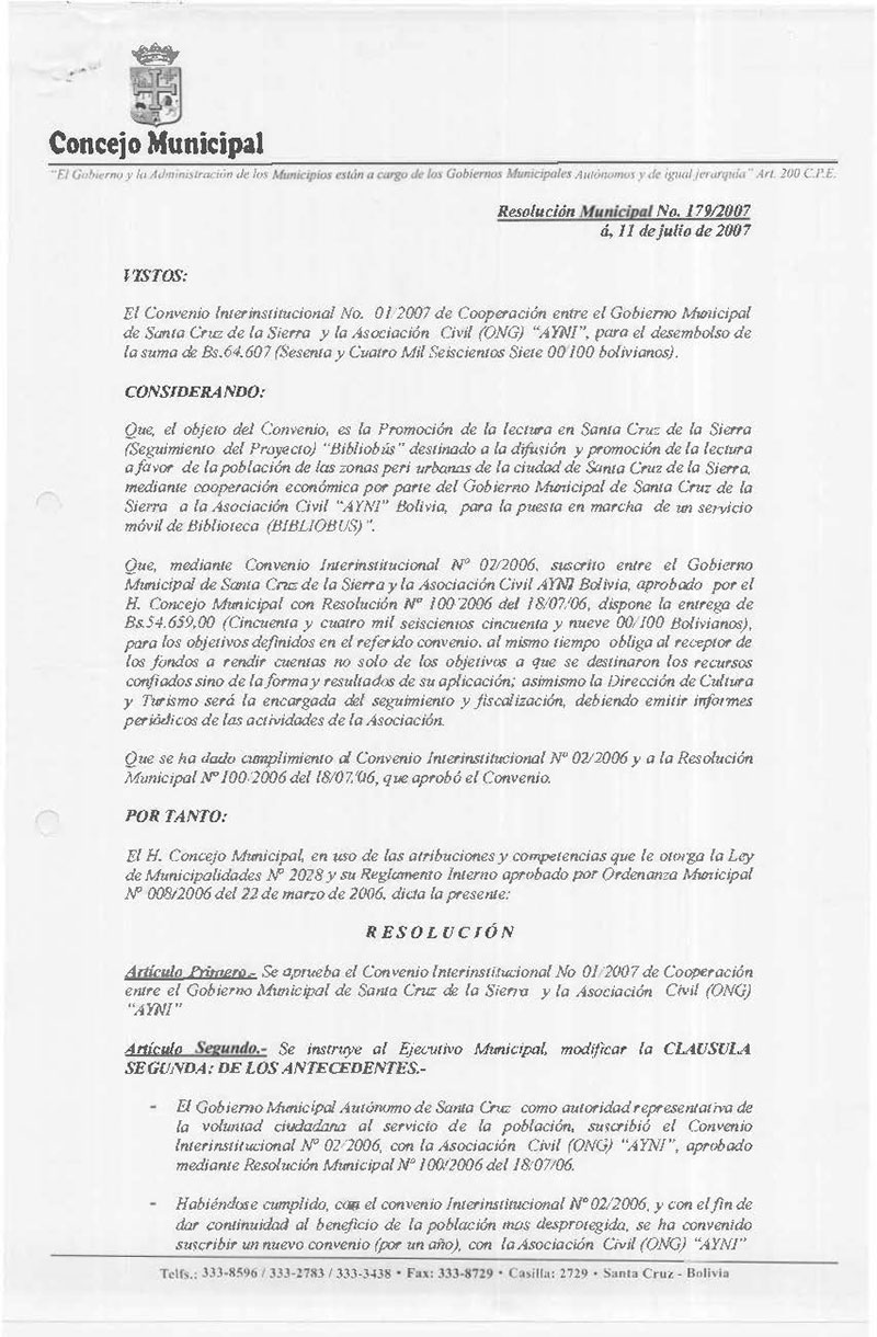 Aprueba el Convenio Interinstitucional N° 01/2007 de Cooperación entre el Gobierno Municipal de Santa Cruz de la Sierra y la Asociación Civil (ONG) “AYNI”, para la promoción de la lectura en Santa Cruz.