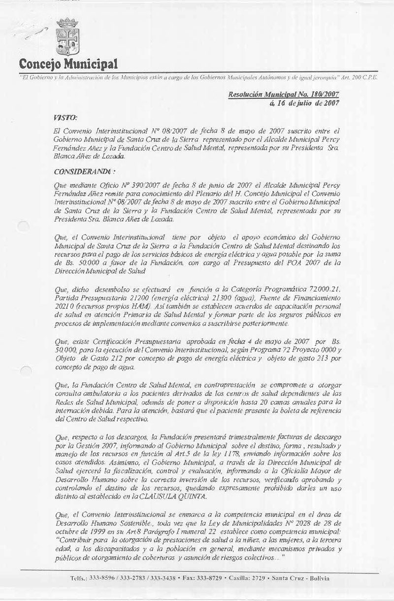 Aprueba el Convenio Interinstitucional Nº 08/ 2007 suscrito entre el Gobierno Municipal de Santa Cruz de la Sierra y la Fundación Centro de Salud Mental, que se enmarca a la competencia municipal de Desarrollo Humano Sostenible.