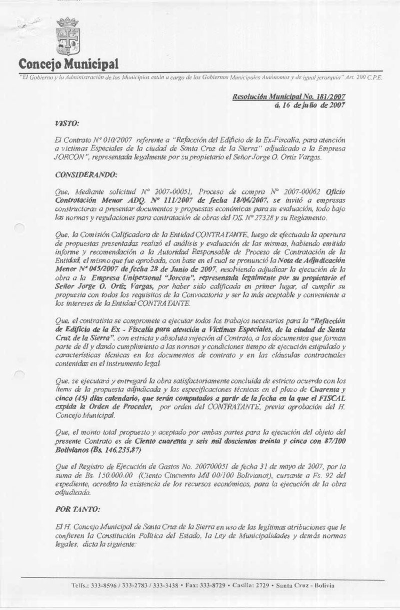 Aprueba el Contrato Nº 010/2007, referente a “Refacción del Edificio de la Ex-Fiscalía, para atención a victimas Especiales de la ciudad de Santa Cruz de la Sierra” adjudicado a la empresa JORCON”.