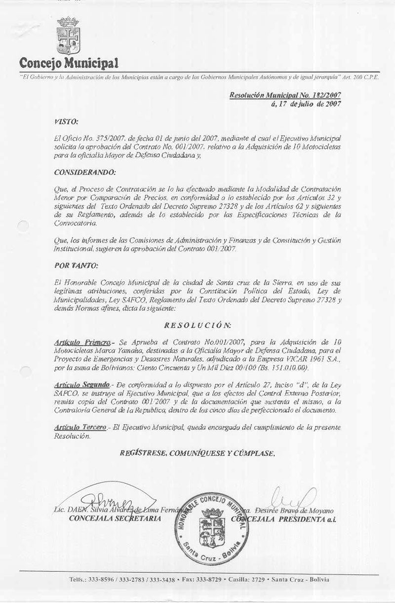 Aprueba el Contrato N° 001/2007, para la Adquisición de 10 Motocicletas Marca Yamaha, destinadas a la Oficialía Mayor de Defensa Ciudadana, para el Proyecto de Emergencias y Desastres Naturales, adjudicado a la Empresa VICAR 1961 S.A., por la suma de Bs. 151.010.00.- (Ciento Cincuenta y Un Mil Diez 00/100).