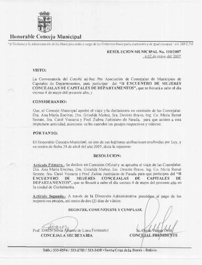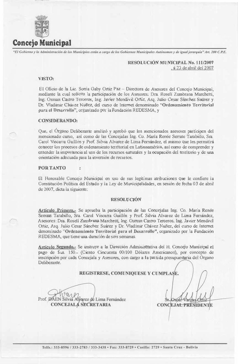 Aprueba la participación de las Concejalas Ing. Maria Rene Serrate, Sra. Carol Viscarra, y Prof. Silvia Alvarez Melgar y los asesores Roseli Zambrana, Osman Castro, Javier Mendivil Ortiz, Julio Cesar Sánchez y Vladimir Chavez Nuñez del curso de Internet ORDENAMIENTO TERRITORIAL PARA EL DESARROLLO.