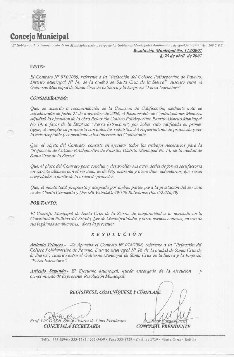 Aprueba el Contrato Nº 074/2006, referente a la “Refacción del Coliseo Polideportivo de Paurito, Distrito Municipal Nº 14, de la ciudad de Santa Cruz de la Sierra”, suscrito con la Empresa “Persa Estructure”.