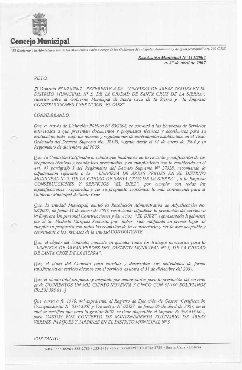 Aprueba el Contrato Nº 095/2007, REFERENTE A LA “LIMPIEZA DE ÁREAS VERDES EN EL DISTRITO MUNICIPAL Nº 5, DE LA CIUDAD DE SANTA CRUZ DE LA SIERRA” , suscrito con la Empresa CONSTRUCCIONES Y SERVICIOS “EL DIEZ”.